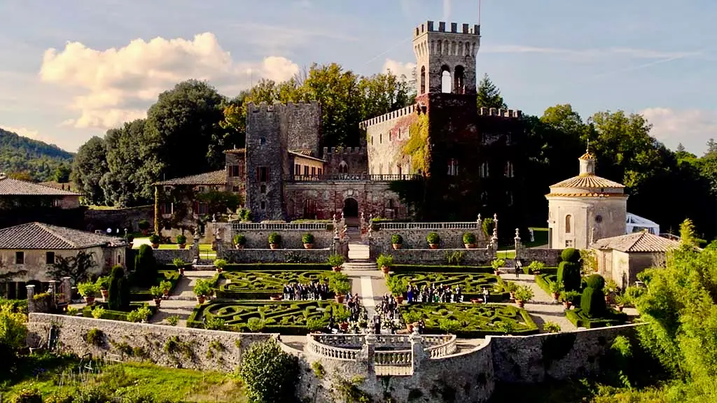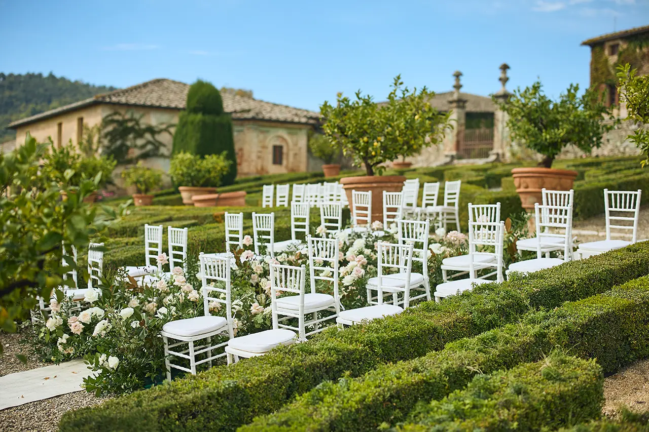 Ai piedi della torre merlata più alta sorge la cappella cinquecentesca, capolavoro dell’architetto Baldassarre Peruzzi, incorniciata dal Giardino all’italiana e dal Parco, un luogo unico dove dirsi “SI” immersi in un’atmosfera d’altri tempi.